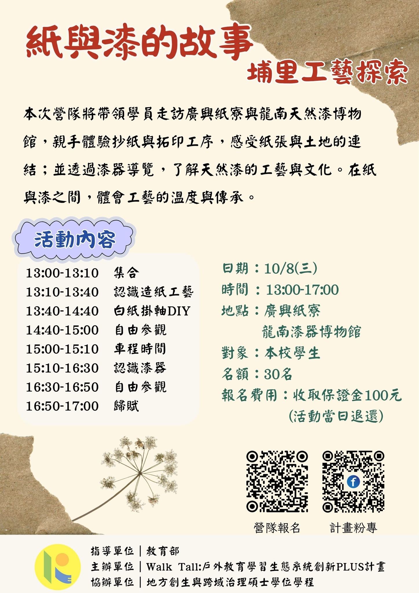 #USR計畫#紙與漆#埔里工藝#廣興紙寮#龍南漆器#1141學期#水沙連營隊#戶外教育#WalkTallplus計畫