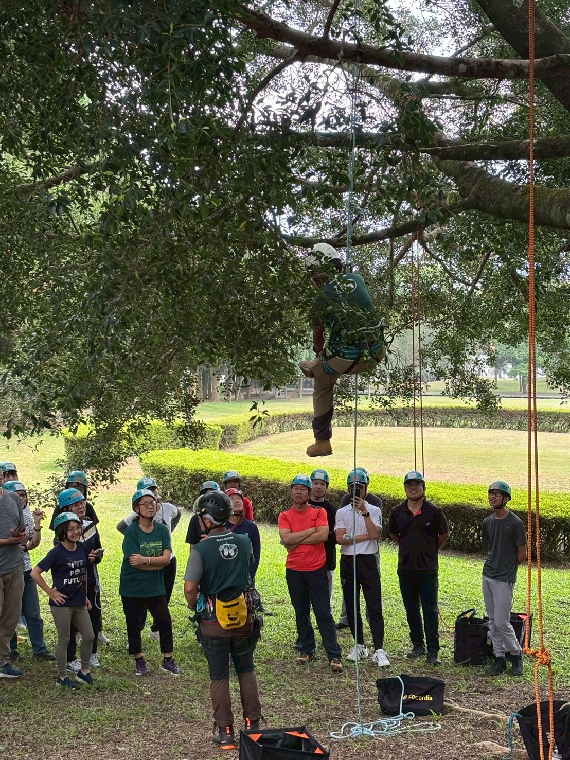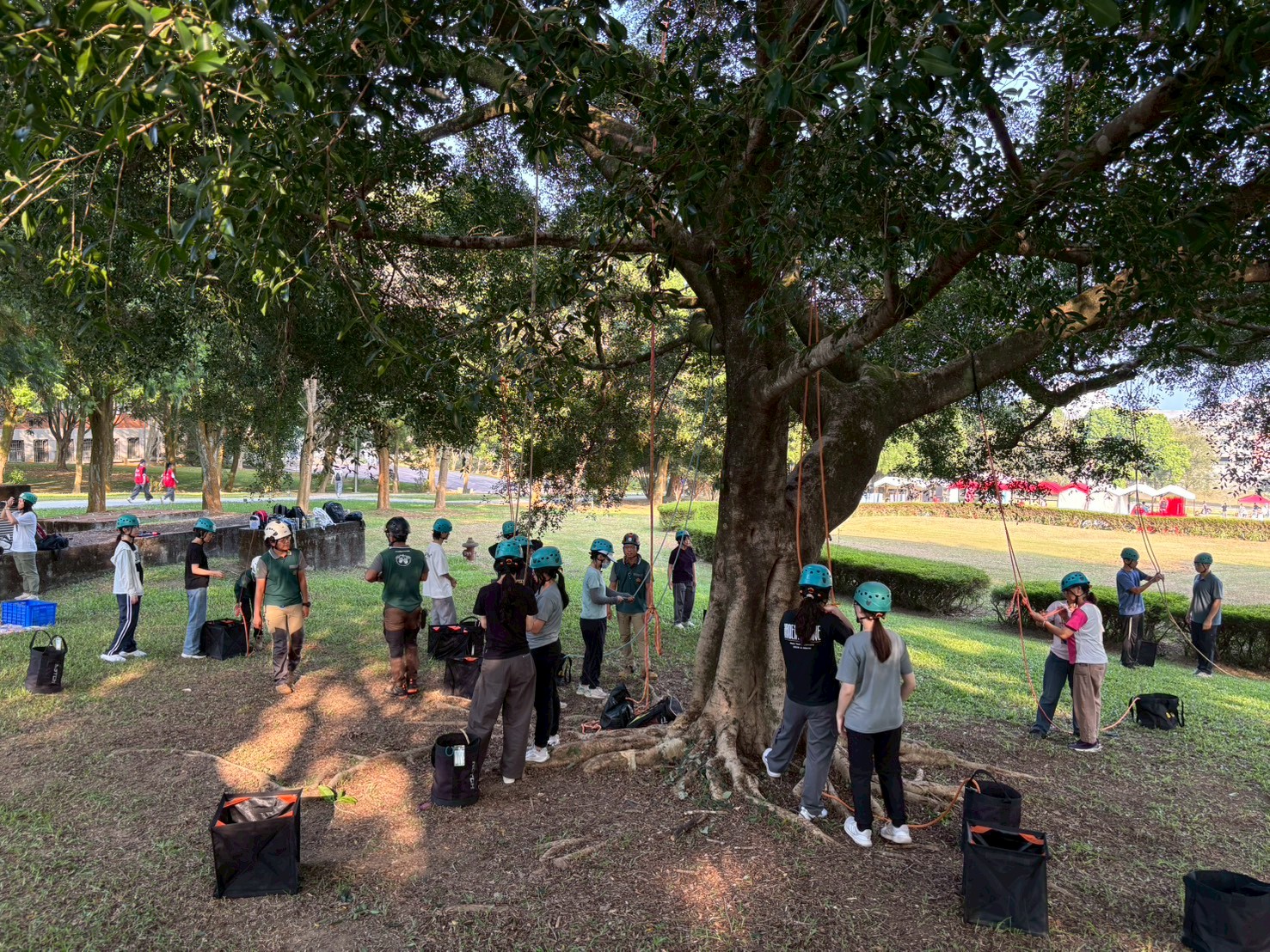 大家一步步嘗試使用普魯士繩爬升、投擲豆袋、安裝樹皮保護器。