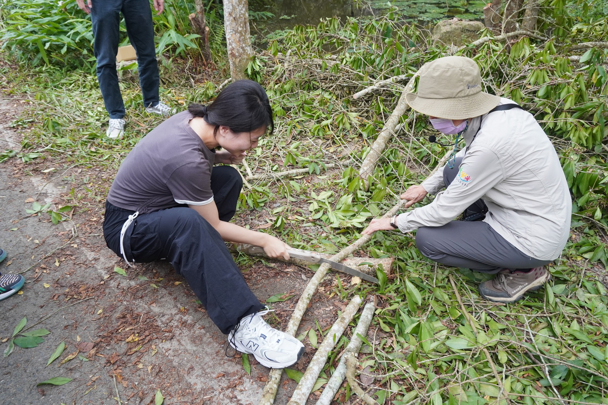 在導覽員指導下,學員們分工合作掘地、栽種蝴蝶喜愛的食草與蜜源植物,並將樹枝鋸成適合的長度擺放,打造蝴蝶的棲息家園。