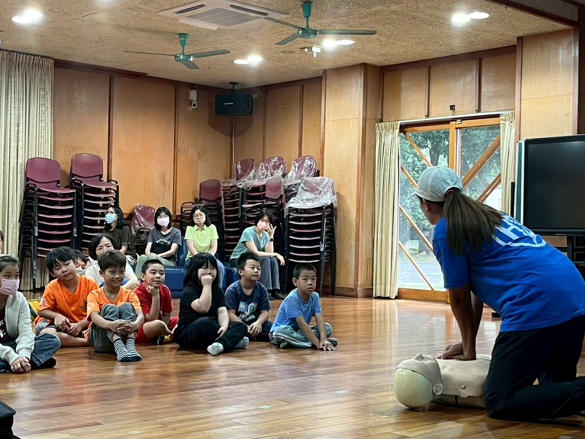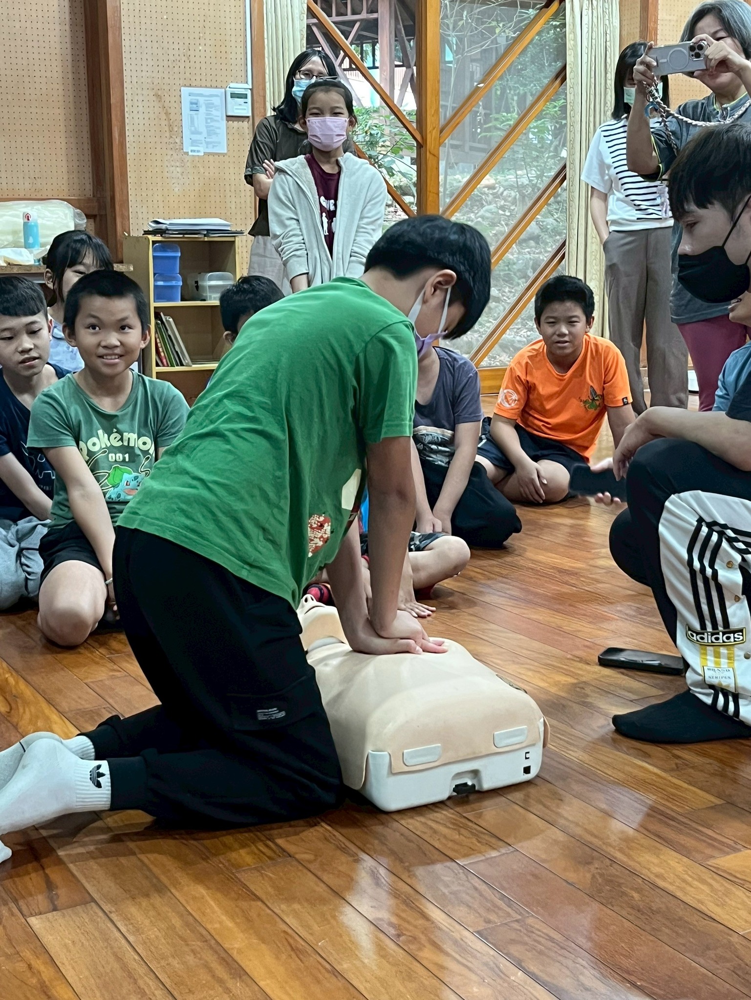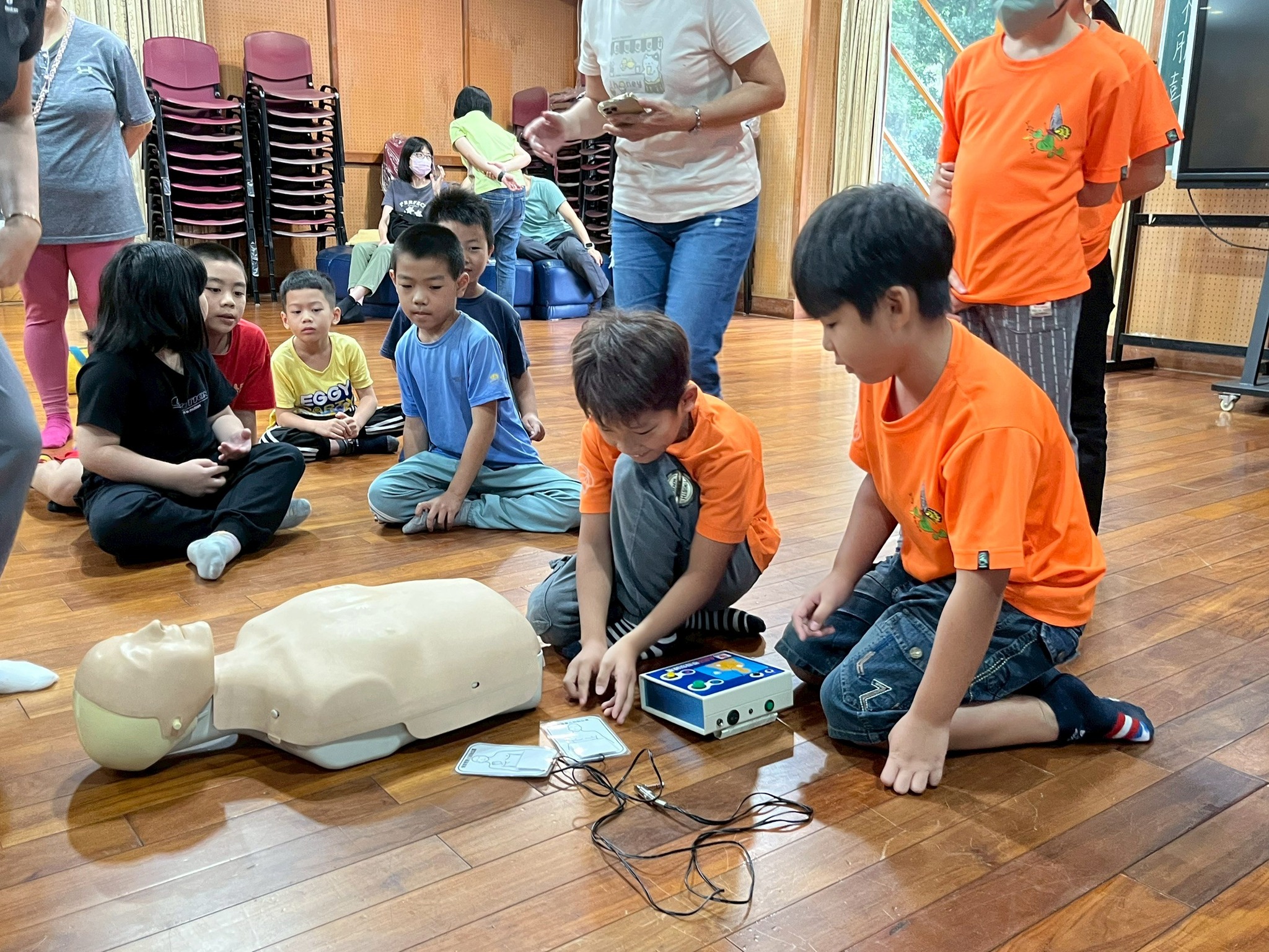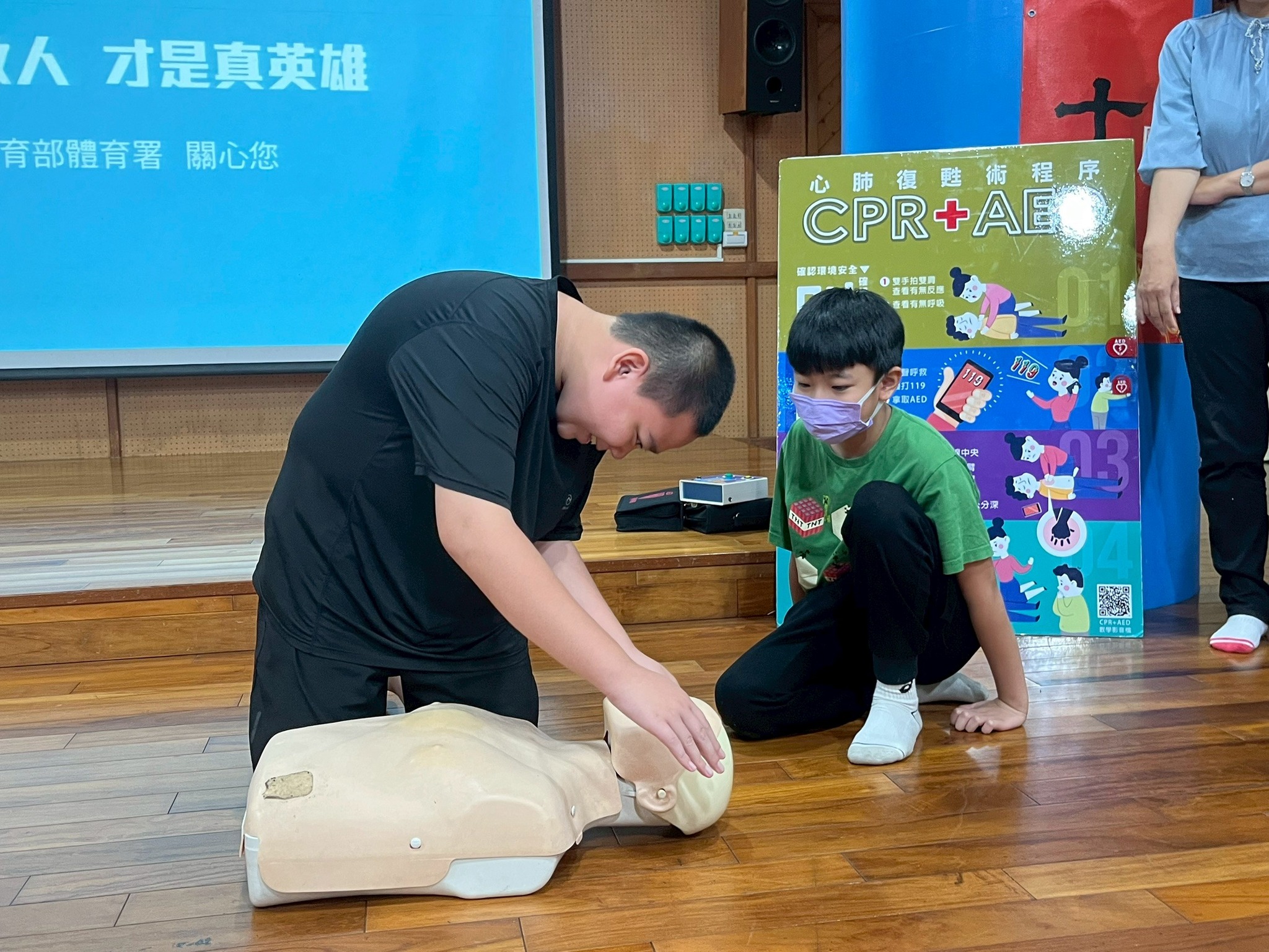 在講解 CPR 的意義後,再逐一拆解每個施作步驟,從評估狀況、壓胸技巧,到 AED 的操作流程,都一步步示範給孩子們看。