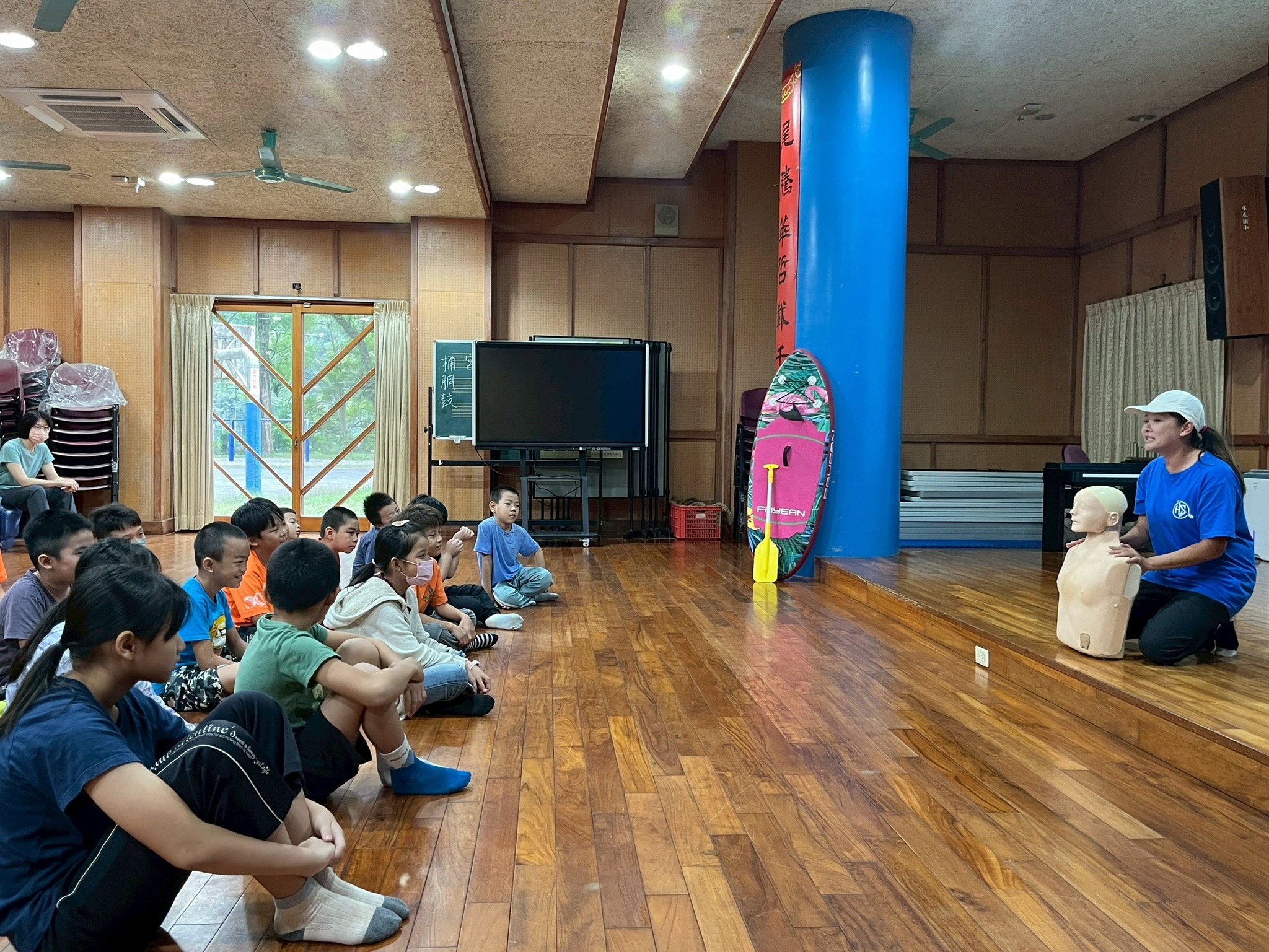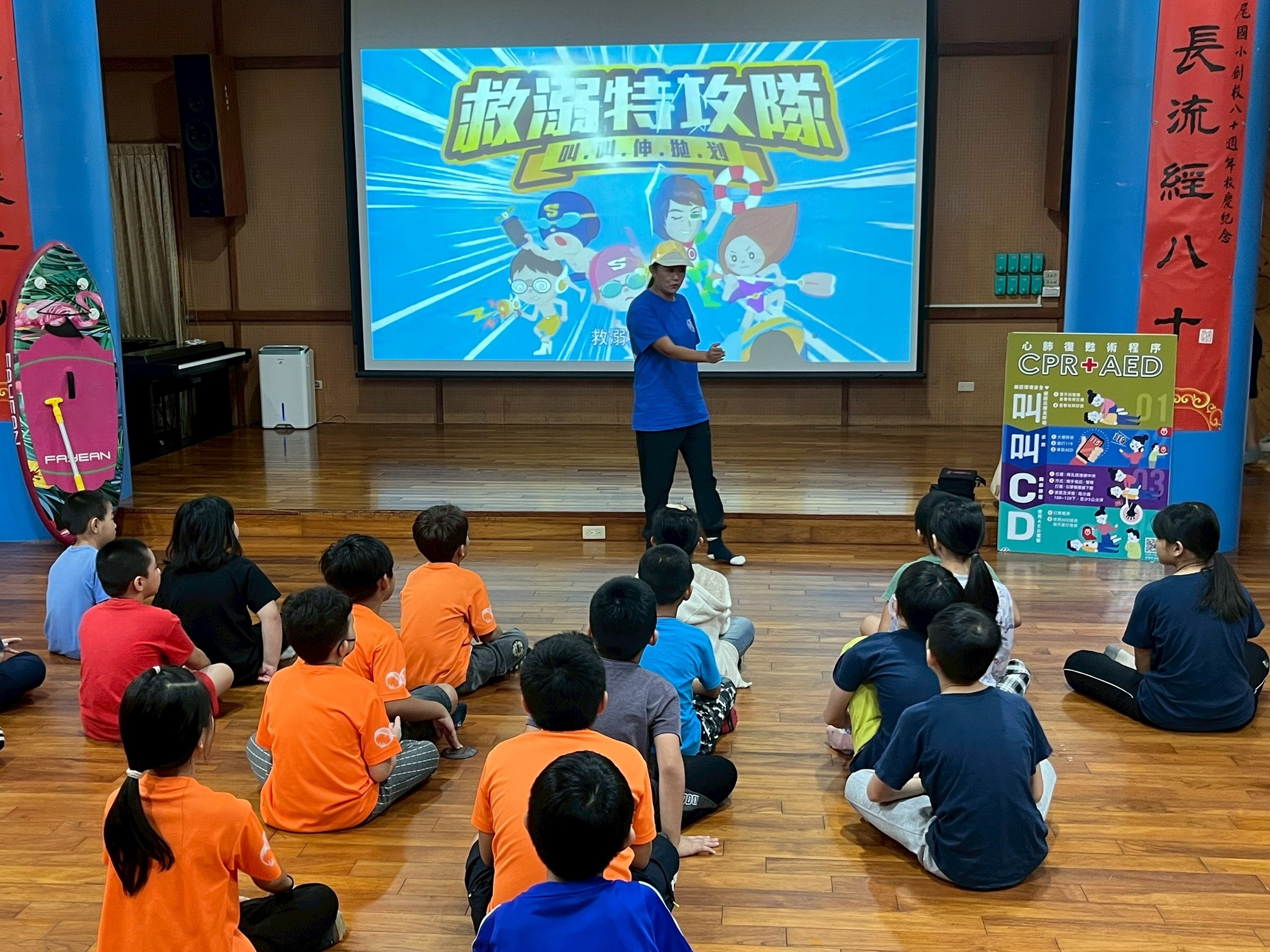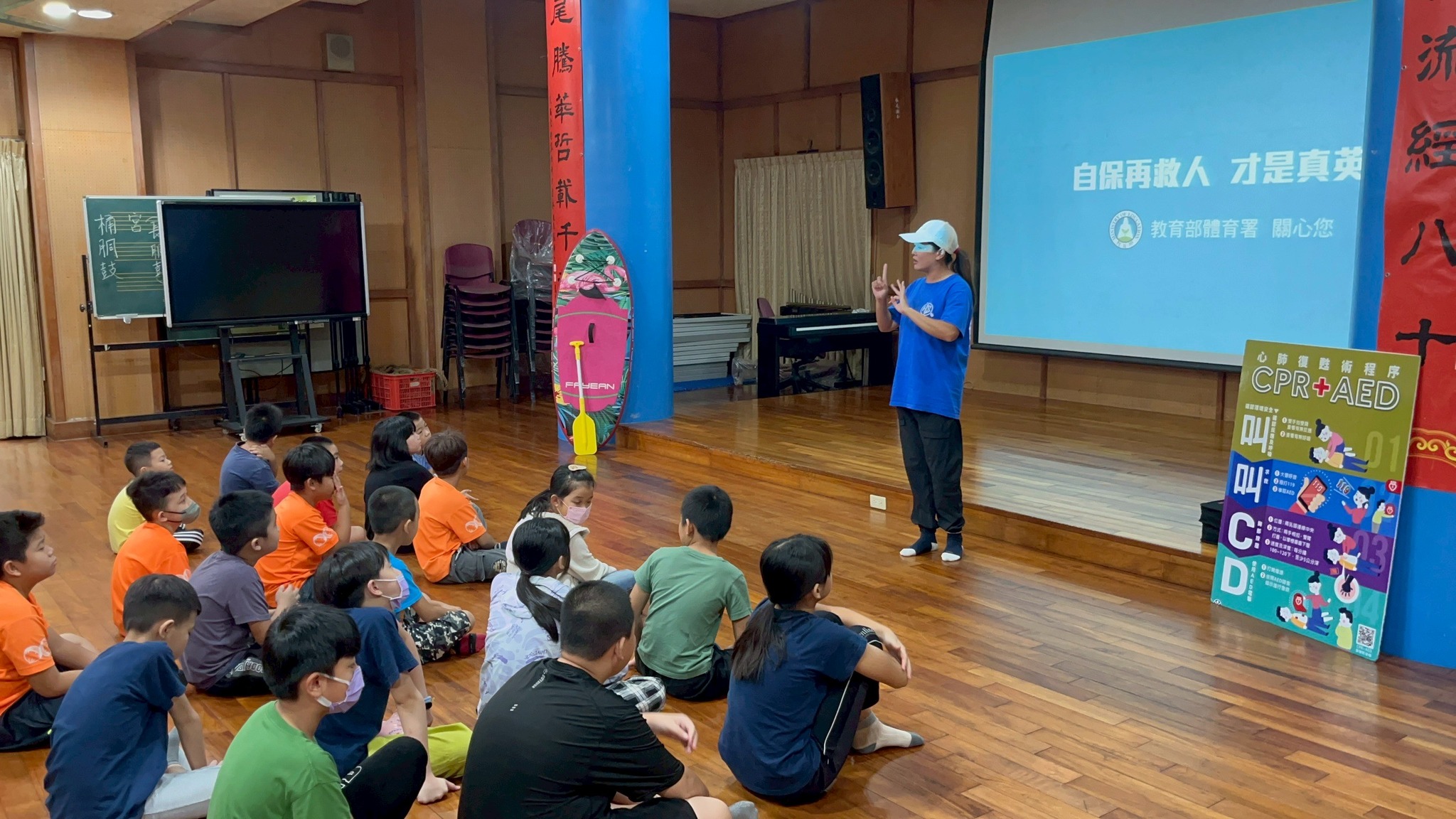 活動一開始,講師先播放水域安全與救溺的宣導影片,讓孩子們了解在日常生活中可能會遇到的危險情境。接著進入今日主題:說明哪些情況會需要使用 CPR 與 AED,並帶著大家認識「叫叫 C-A-B」的急救原則。