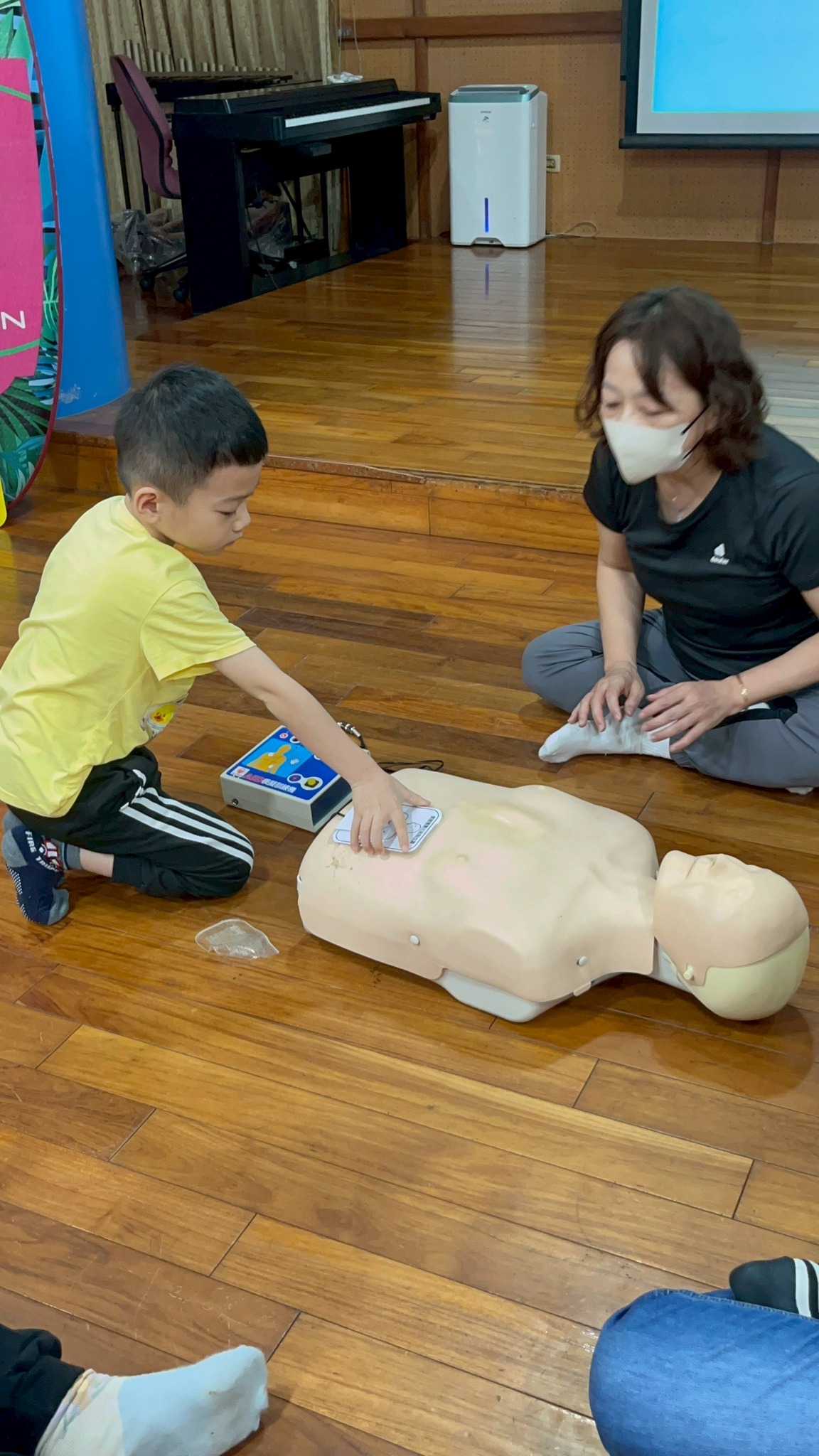 並將低年級與高年級小朋友分兩組,一組操作安妮練習 CPR,另一組實際操作 AED 模擬機,最後再交換體驗。孩子們都非常投入,練習得又認真又可愛!